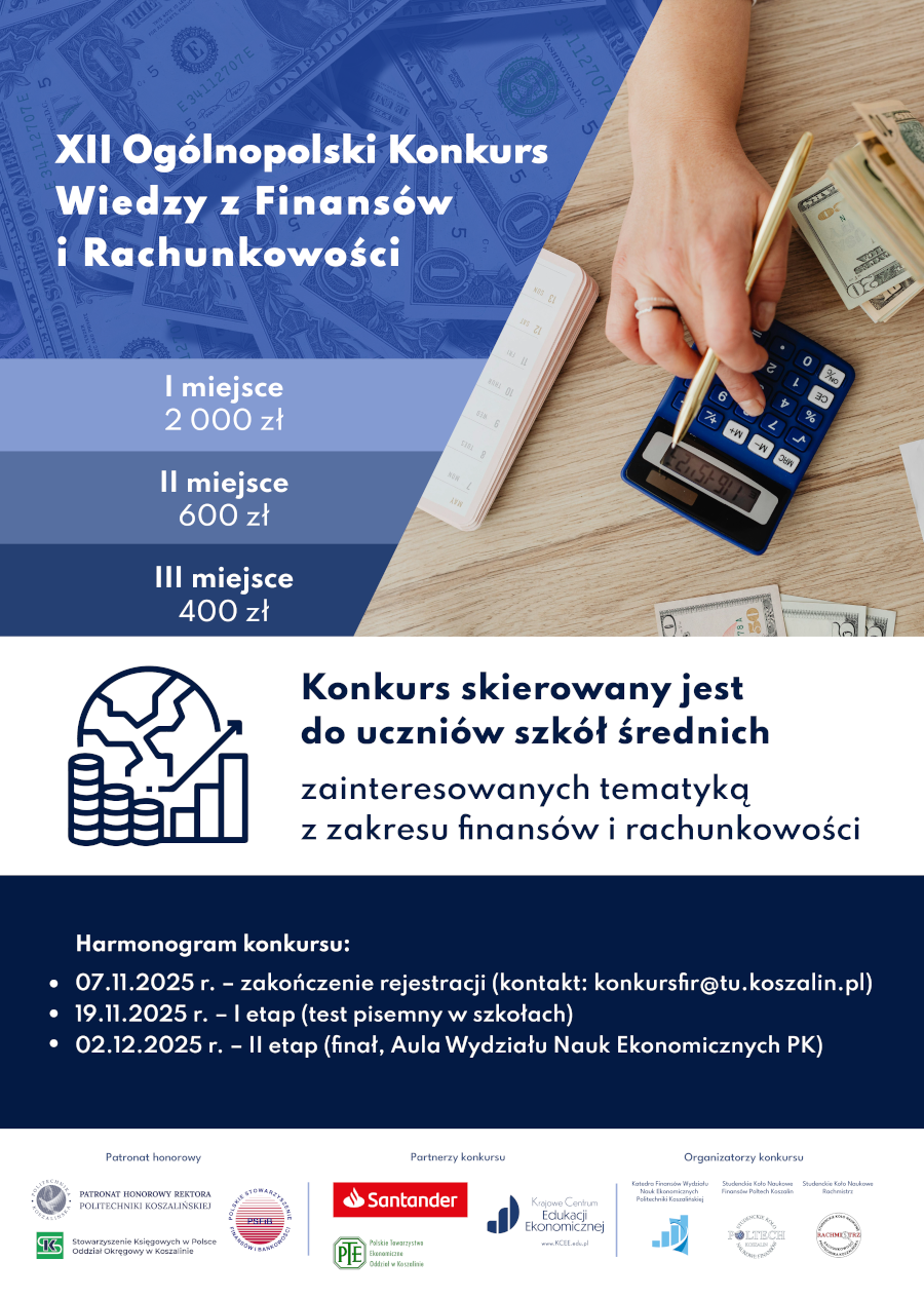 Katedra Finansów Wydziału Nauk Ekonomicznych Politechniki Koszalińskiej wraz ze Studenckim Kołem Naukowym Finansów POLTECH Koszalin oraz Studenckim Kołem Naukowym Rachmistrz serdecznie zapraszają uczniów szkół średnich do wzięcia udziału w XII Ogólnopolskim Konkursie Wiedzy z Finansów i Rachunkowości.