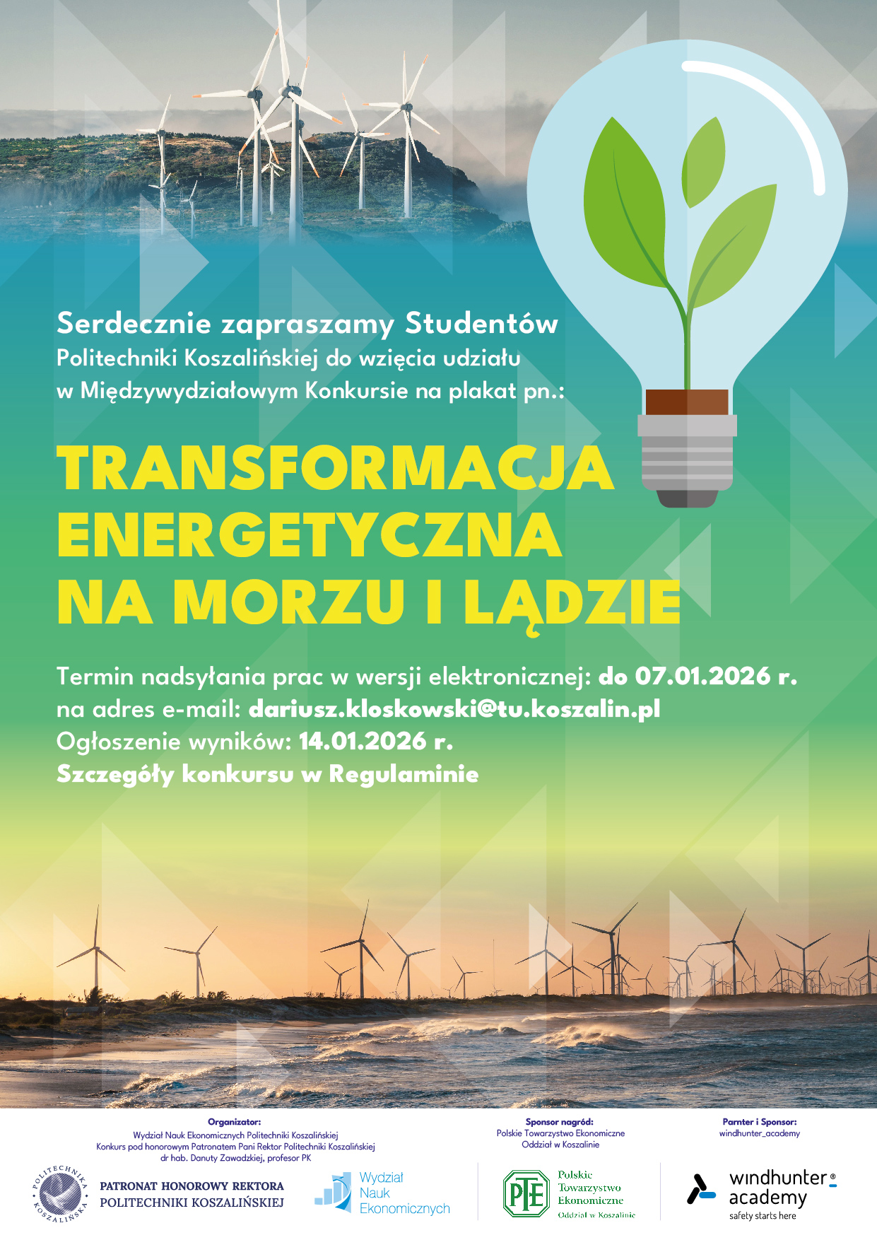 Serdecznie zapraszamy Studentów Politechniki Koszalińskiej do wzięcia udziału w Międzywydziałowym Konkursie na najciekawszy plakat pn.: „Transformacja energetyczna na morzu i lądzie” organizowanym przez Wydział Nauk Ekonomicznych Politechniki Koszalińskiej, realizowanym pod honorowym Patronatem Rektora Politechniki Koszalińskiej dr hab. Danuty Zawadzkiej, prof. PK. Tematem prac powinno być przedstawienie wybranych zagadnień z zakresu transformacji energetycznej związanej z systemowym procesem przechodzenia z tradycyjnych źródeł energii na odnawialne źródła energii (OZE), wynikające z wykorzystania: Słońca, wiatru, wodoru, atomu i biomasy.