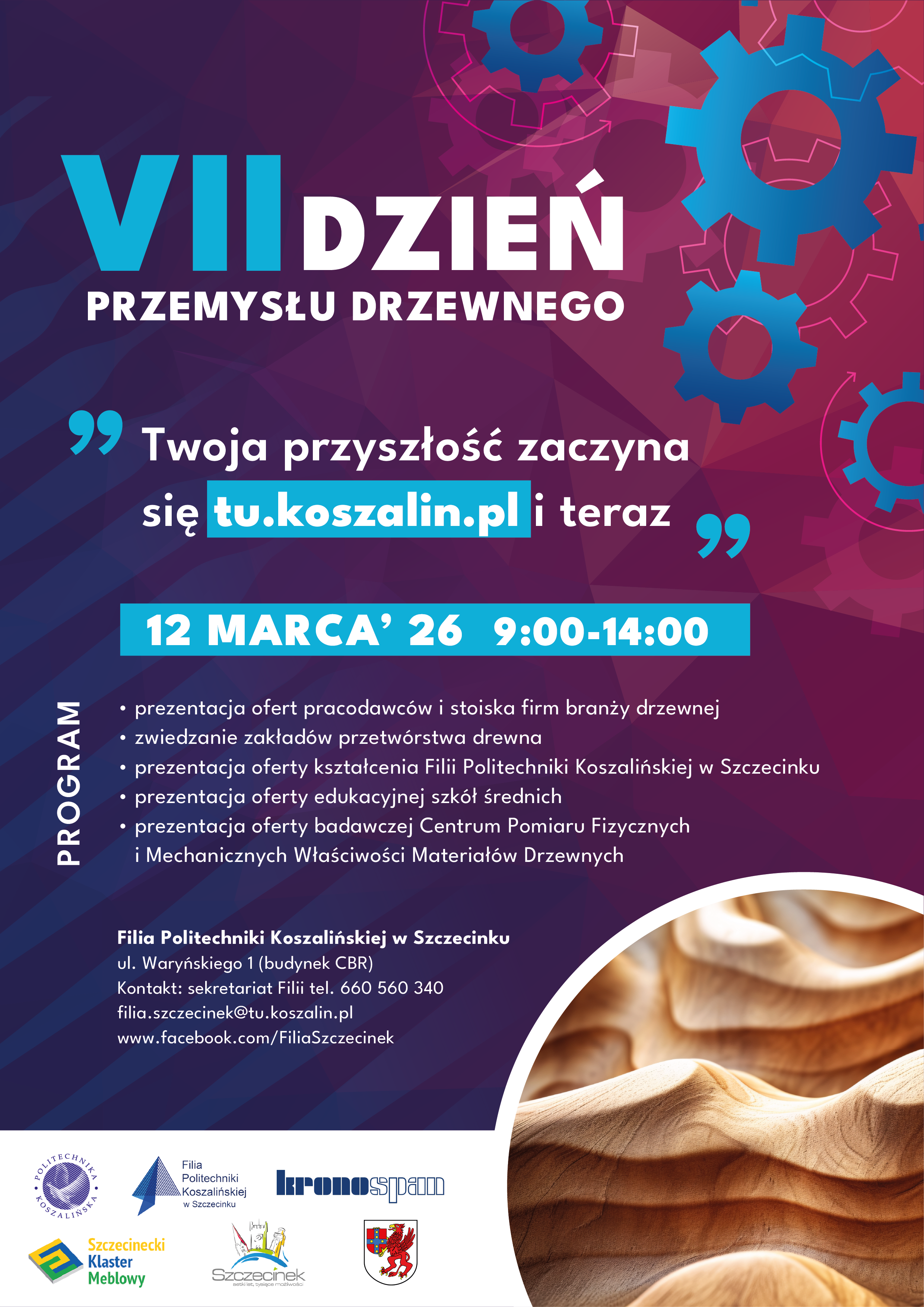 Filia Politechniki Koszalińskiej w Szczecinku zaprasza do udziału w VII Dniu Przemysłu Drzewnego, który odbędzie się 12 marca 2026 roku. Wydarzenie skierowane jest do uczniów, studentów, nauczycieli oraz wszystkich zainteresowanych branżą drzewną i nowoczesnymi technologiami związanymi z przetwórstwem drewna.